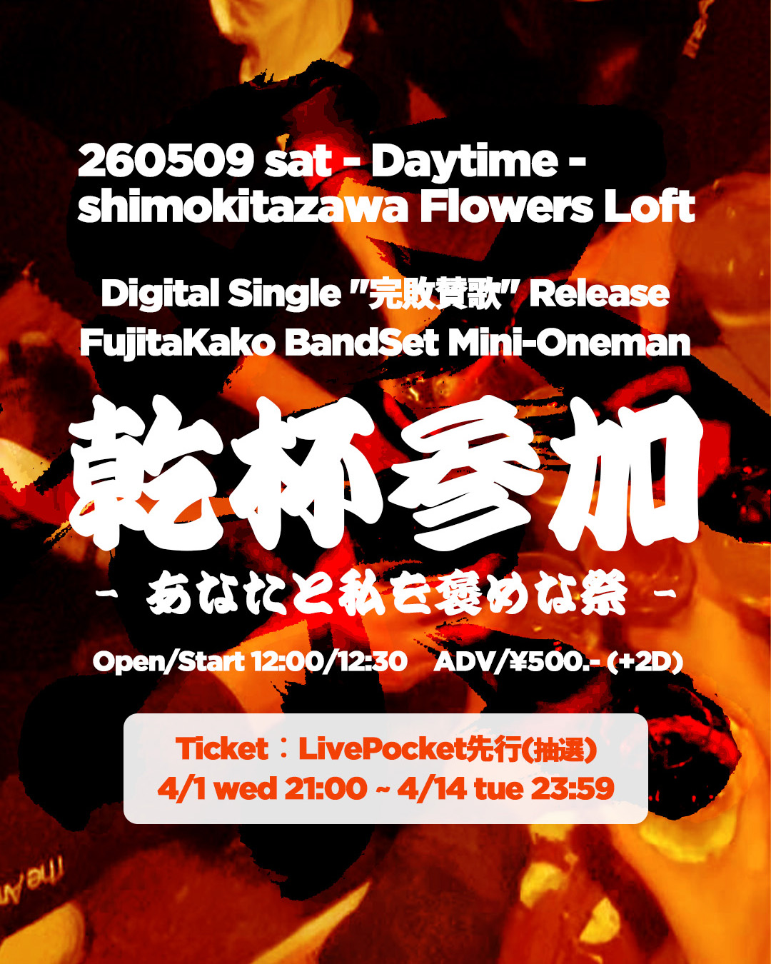 SCHEDULE 2026 05 09 Saturday DAY EVENT フジタカコ BandSet Mini-Oneman “乾杯参加 – あなたと私を褒めな祭 -“ OPEN 12:00 - START 12:30 Tweet フジタカコ TICKETADV ¥500 (+2Drink ¥1,200) 【TICKET】 LivePocket (2026/4/1 21:00〜2026/4/14 23:59)※抽選 #フジタカコ Share