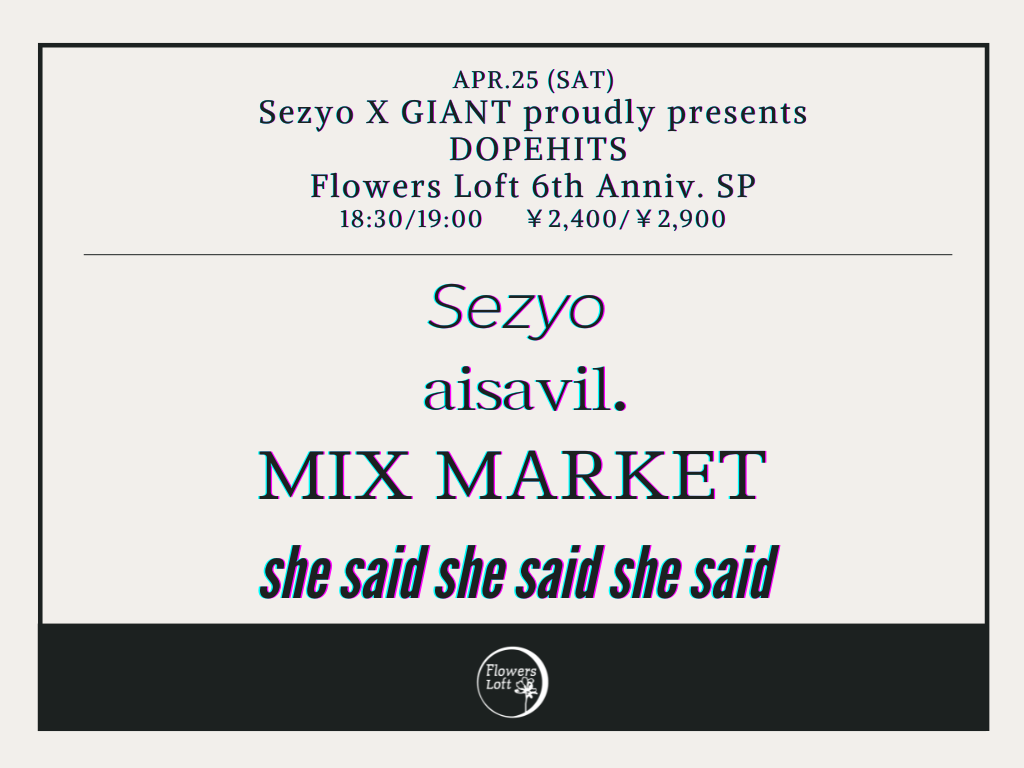 SCHEDULE 2026 04 25 Saturday Sezyo X GIANT proudly presents DOPEHITS Flowers Loft 6th Anniv. SP OPEN 18:30 - START 19:00 Tweet 出演: Sezyo she said she said she said MIX MARKET aisavil. DJ GIANT TICKET¥2,400/¥2,900 (D別) バンド予約または以下より Share チケット予約