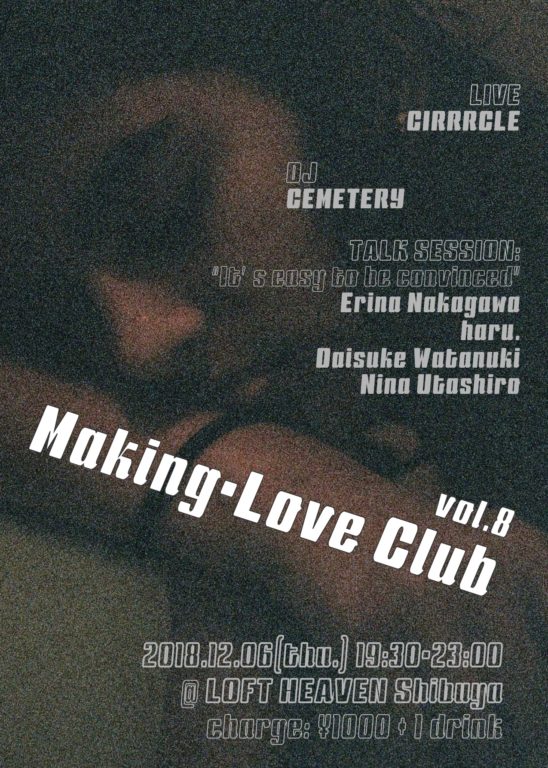 政治も愛もセックスも、同じテーブルの上で話せる空間を目指すカルチャーイベント&マガジン。イベントでのトークセッションではカルチャーが交錯する時代を捉え、日常議論されにくい話題も、ターゲット層が潜在的な興味を寄せるテーマとしてざっくばらんに取り上げる。マルチクリエイター/PETRICHOR編集長として注目を集める歌代ニーナや、インディペンデントマガジン『HIGH(er)』編集長を務めるharu.、『Emotional Love』編集長の綿貫大介らがトークセッションに参加するほか、モデレーターとしてモデルの中川えりなが登壇する。東京/ロサンゼルスを拠点に活動する国際派ヒップホップクルー、CIRRRCLEによるスペシャルライブが開催されるほか、9月にはベルギーのレーベル <Slagwerk>からシングル’l-qk’をリリースしCEMETERYによるDJパフォーマンスが行われる。また、昨年9月に第一号をリリースした紙媒体『Making-Love Club』の issue 6 ローンチイベントも兼ねており、会場ではバックナンバーも併せて購入可能。#makingloveclub