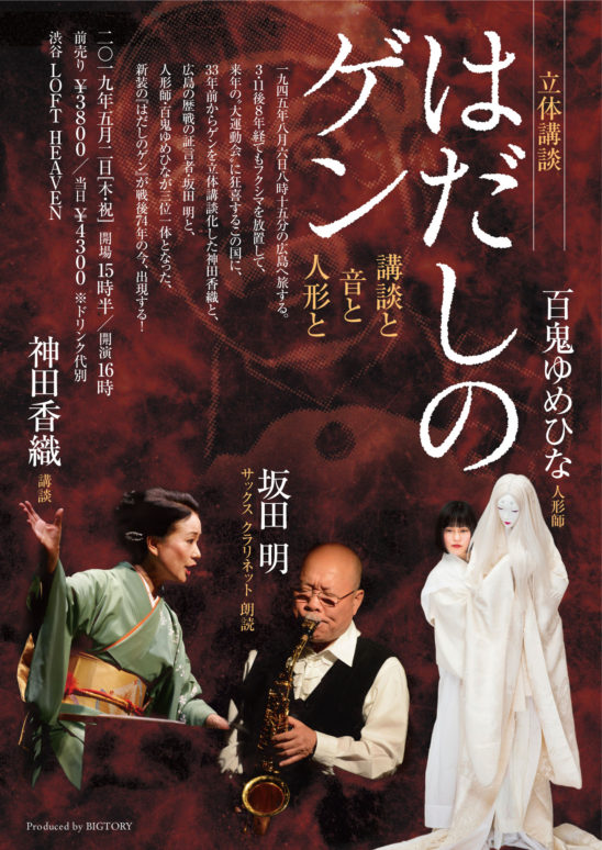 3・11後8年経てもフクシマを放置して、来年の<大運動会>に狂喜するこの国に、28年前からゲンを立体講談化した神田香織と、広島の歴戦の証言者・坂田明と、人形師・飯田美千香の百鬼ゆめひなが三位一体となった、新装の『はだしのゲン』が戦後74年の今、出現する!