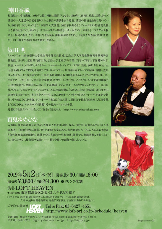 神田香織(講談)坂田明(sax・cllarinet・朗読)飯田美千香(百鬼ゆめひな人形師)