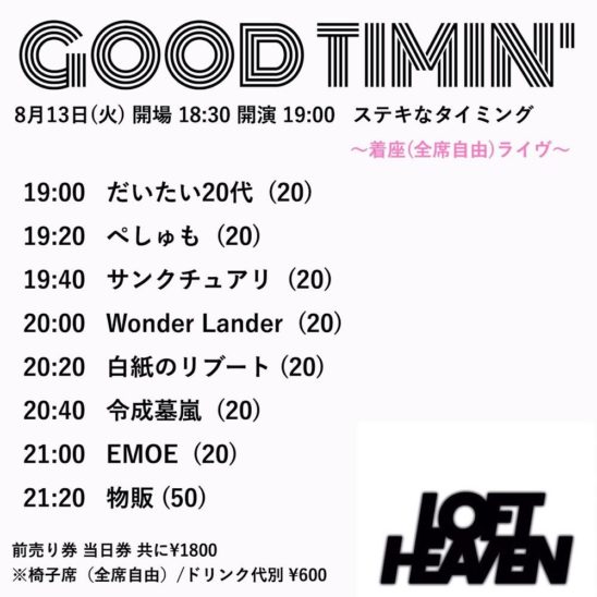 SCHEDULE 2019 08 13 Tuesday ステキなタイミング OPEN 19:00 - START 19:30 Tweet 【出演】 EMOE ぺしゅも Wonder Lander 白紙のリブート だいたい20代 サンクチュアリ 令成墓嵐 TICKETADV / DOOR ¥1,800 ※椅子席(全席自由)/ドリンク代別 ¥600 ※先着順入場 Share