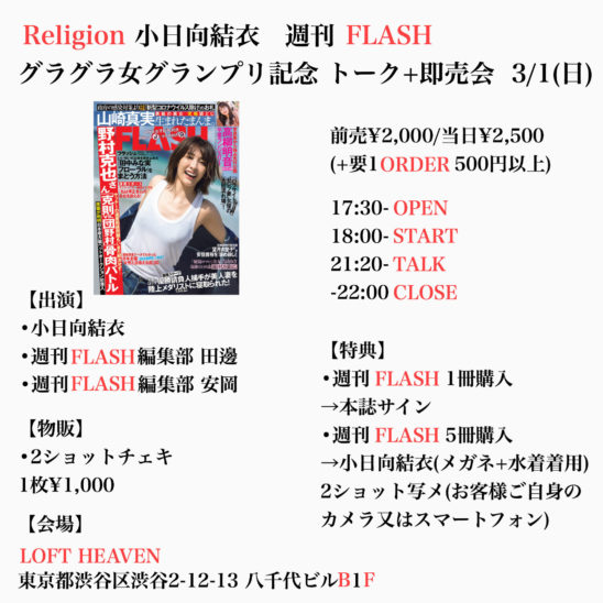 SCHEDULE 2020 03 01 Sunday Religion 小日向結衣 週刊FLASH グラグラ女グランプリ記念 即売会イベント OPEN 17:30 - START 18:00 Tweet 【出演】 小日向結衣 TICKETADV ¥2,000/ DOOR ¥2,500 ※椅子席(全席自由)/ドリンク代別 ¥600 ※整理番号順入場となります 【チケット】 https://t.livepocket.jp/e/200301 受付期間:2020/2/25(火) 12:00 〜 2020/3/1(日) 00:00 Share