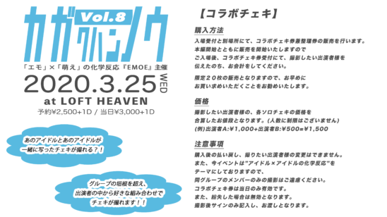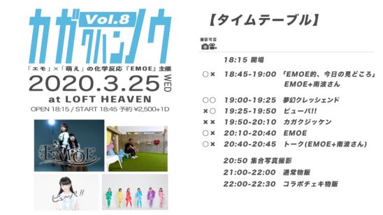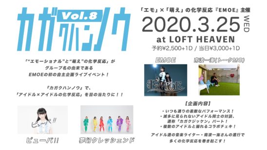 SCHEDULE 2020 03 25 Wednesday カガクハンノウ vol.8 OPEN 18:15 - START 18:45 Tweet 【出演】 EMOE ピューパ!! 夢幻クレッシェンド and more… 【MC】 南波一海 ※予定していた「エレファンク庭」の出演は諸事情により無くなりました。 TICKETADV ¥2,500/ DOOR ¥3,000 ※全自由/ドリンク代別 ¥600 ※先着順入場 Share