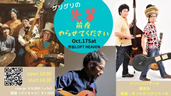 今回はギターヒーロー、ネタンダーズの塚本功さんソロと、近くで見続けているのに声かけることができずにいたバンバンバザールの胸を借りて前座やらせていただきます!
