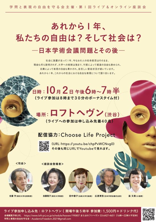社会に激震が走って1年、今なお6人の任命拒否はそのまま、理由も何ら説明されず、大学への統制は強まり、忖度によって報道の自由も狭められ、自粛によって表現の自由も脅かされ、息苦しい窒息状況が続いています。あれから1年、これからの社会における自由な表現について語り合います。