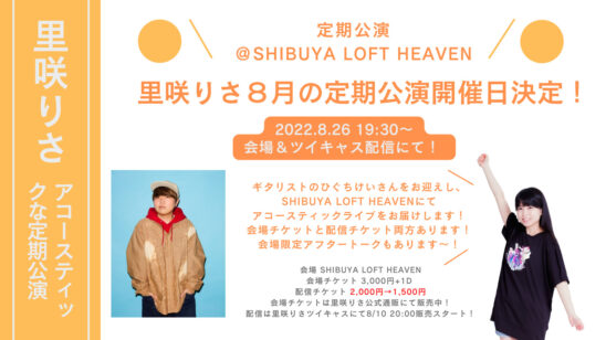 今回は先日スタジオライブを開催し大好評だった、ひぐちけいさんをお迎えしてのアコースティック形式での開催です!ギター1本と、さとさきりさの歌の構成です。
