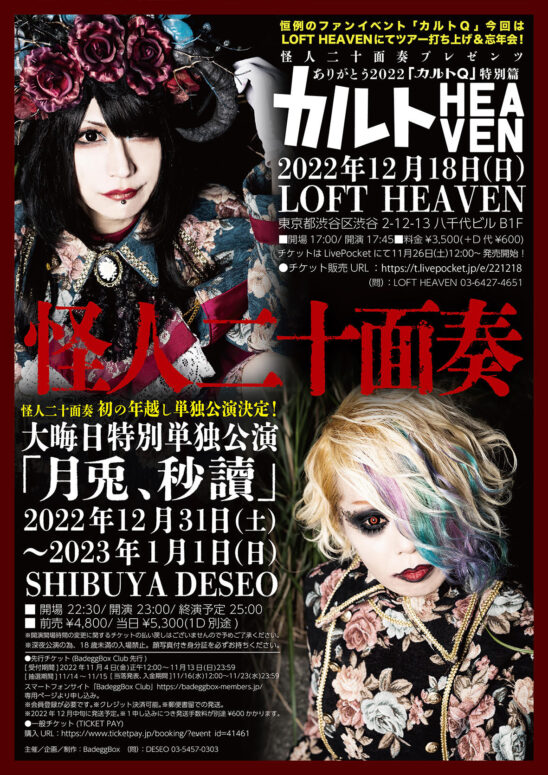 SCHEDULE 2022 12 18 Sunday 怪人二十面奏プレゼンツ ありがとう2022「カルトQ」特別篇「カルトHEAVEN」 OPEN 17:00 - START 17:45 Tweet 【出演】 怪人二十面奏 <会場へお越しの方へ> 「ライブホール・ライブハウスにおける新型コロナウイルス感染拡大予防ガイドライン(改訂版)」をご覧ください。 TICKET▼料金 <会場チケット> 前売 ¥3,500 (税込/+1D¥600) 会場チケット購入 https://t.livepocket.jp/e/221218 販売期間:2022/11/26(土) 12:00 〜 2022/12/17(土) 23:59 整理番号順入場 Share
