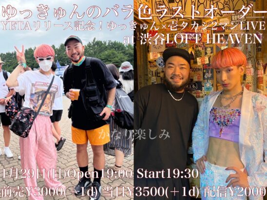毎月恒例の「ゆっきゅんのバラ色流星群」、今回は12/28にリリースされた新EP『YETA』リリース記念といたしまして、収録曲『last order』の作曲・編曲を手掛けた壱タカシさんをお招きしてスペシャルツーマンライブを開催します。