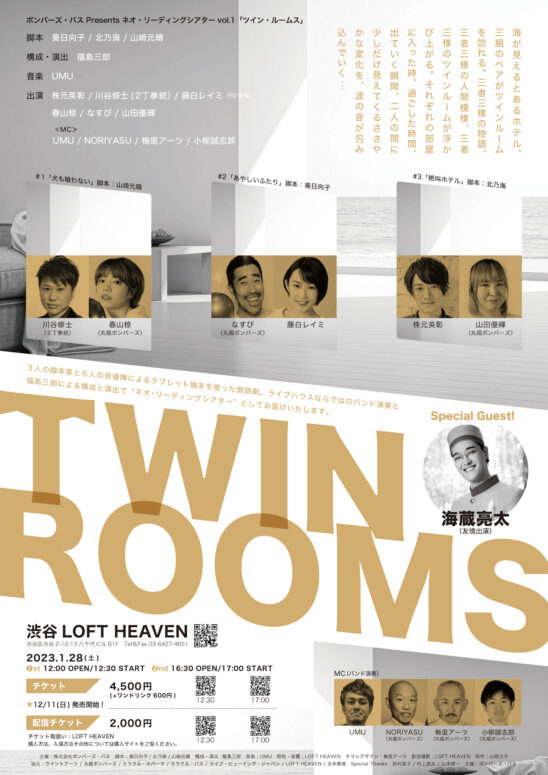 丸福ボンバーズ 第16回本公演「こんな夜の唄」12/13(火)~12/18(日)@APOCシアターの各公演開演前・終演後に「ツイン・ルームス」の会場紙チケットを受付にて販売いたします‼️ぜひ劇場でお買い求めください