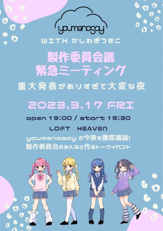 SCHEDULE 2023 03 17 Friday youmenosay with かしわぎつきこ 製作委員会議 “緊急ミーティング” 重大発表がありすぎて大変な夜 OPEN 19:00 - START 19:30(END 21:30予定)※終演後物販アリ Tweet 【出演】 youmenosay @youmenosay かしわぎつきこ @kstk39 《会場のみ/配信ナシ》 TICKET前売¥2,500 / 当日¥3,000(+drink) 前売券は2/26(日)20時よりLivePocketにて発売 Share
