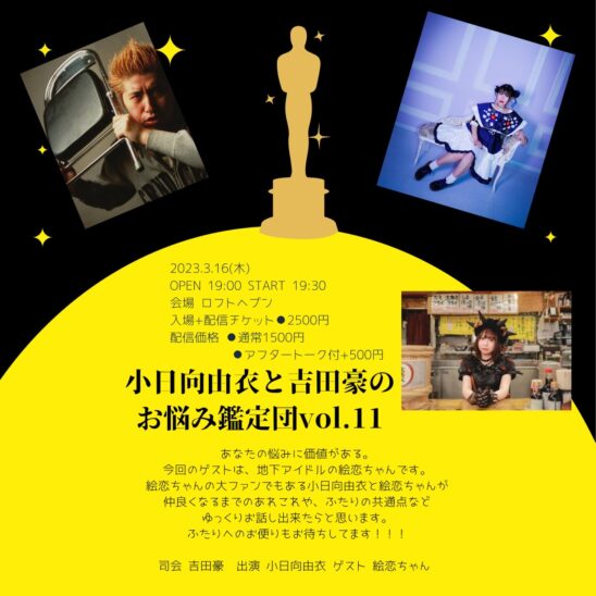 吉田豪さん南波一海さんからも一目置かれる“シンガーソングライター” レジェンドこと、小日向由衣さんが皆様からのお悩みを募集して、それを“進行兼カウンセラー”吉田豪さんと共に答えていくイベントだったのですが、いつのまにか小日向さんが豪さんにお悩みを相談をしているでおなじみ『小日向由衣と吉田豪のお悩み鑑定団』第11弾 開催決定!!