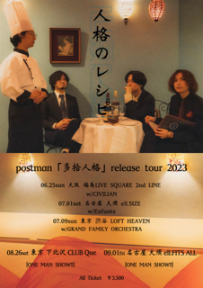 SCHEDULE 2023 07 09 Sunday postman「多拾人格」release tour 2023 “人格のレシピ” OPEN 18:30 - START 19:00 Tweet 【出演】 postman 【ゲスト】 GRAND FAMILY ORCHESTRA TICKET<会場チケット> 前売¥3,500/当日¥4,000(ドリンク代¥600別途) URL:https://w.pia.jp/t/postman/ 一般発売:2023/4/29 10:00~ Share