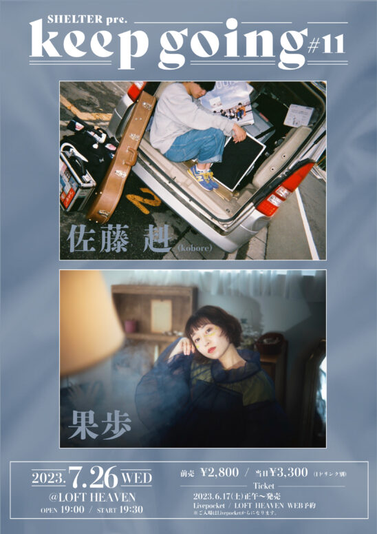 SCHEDULE 2023 07 26 Wednesday “keep going”#.11 OPEN 19:00 - START 19:30 Tweet 【出演】 佐藤赳(kobore) 果歩 TICKET前売¥2,800/当日¥3,300 ※椅子席(全席自由) ※入場時、別途ドリンク代別 ¥600必要 ※整理番号順入場となります/入場順(Livepocket→お店Web予約) https://t.livepocket.jp/e/20230726 受付日時:2023/6/17(土) 12:00 〜 2023/7/25(火) 23:59 Share このイベントの予約は締めきりました。