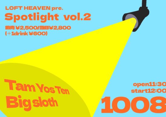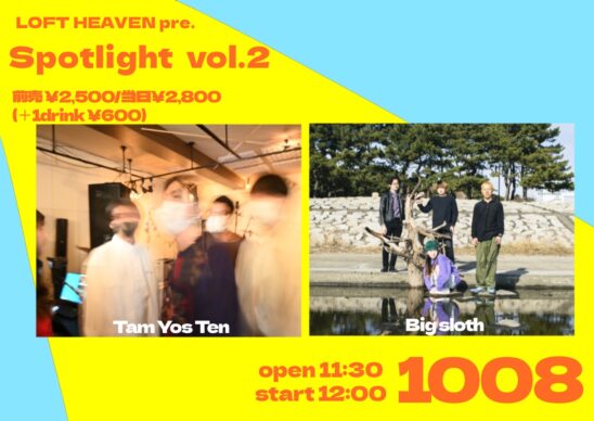 SCHEDULE 2023 10 08 Sunday DAY EVENT LOFT HEAVEN pre. Spotlight vol.2 OPEN 11:30 - START 12:00 Tweet 【出演】 Tam Yos Ten Big sloth TICKET【料金】 前売¥2,500/当日¥2,800(1ドリンク代¥600別途必要) ※先着順入場 ご予約は下記フォームまたは各アーティストまで! Share このイベントの予約は締めきりました。