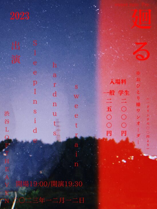 SCHEDULE 2023 12 12 Tuesday sweet rain pre. 「廻る」 OPEN 19:00 - START 19:30 Tweet 【出演】 SleepInside hardnuts sweet rain TICKET【料金】 一般¥2,500/学割¥2,000(ドリンク代¥600別途必要) ご予約はこちらから↓ https://onl.tw/z16K6yy Share
