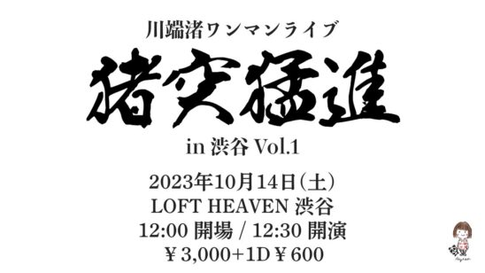 SCHEDULE 2023 10 14 Saturday DAY EVENT 川端渚ワンマンライブ 『猪突猛進 in 渋谷 Vol.1』 OPEN 12:00 - START 12:30 Tweet 【出演】 川端渚 TICKET<会場チケット> 料金¥3,000(+drink) 会場チケット予約 https://tiget.net/events/273275 受付終了日時:2023/10/13 20:00 まで Share
