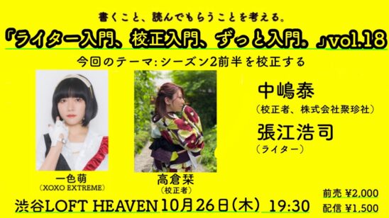 何ならついでに若い人材も業界に入ってきてほしい。というようなことを、「校正・校閲の仕事を専門とするプロフェッショナル集団」聚珍社の中嶋泰と、フリーライターの張江浩司が多種多様なゲストお迎えしつつ、定期的にお酒を飲みながらぼんやりと話していくイベントです。
