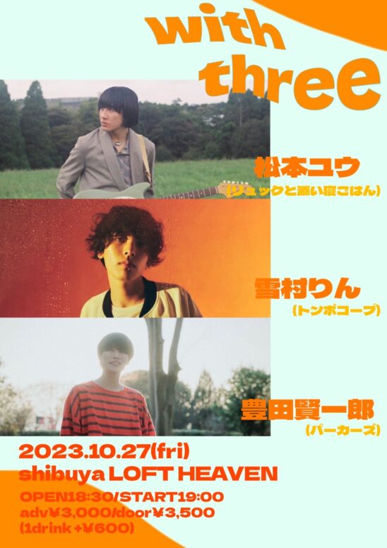 SCHEDULE 2023 10 27 Friday 『with three』 OPEN 18:30 - START 19:00 Tweet 【出演】 松本ユウ(リュックと添い寝ごはん) 雪村りん(トンボコープ) 豊田賢一郎(パーカーズ) TICKET【料金】 前売¥3,000/当日¥3,500(ドリンク代¥600別途必要) http://t.livepocket.jp/e/20231027 受付日時:2023/10/10(火) 20:00 〜 2023/10/26(木) 23:59 Share