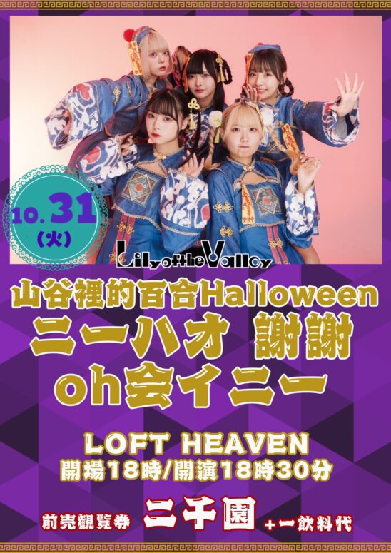SCHEDULE 2023 10 31 Tuesday 山谷裡的百合Halloween~ニーハオ謝謝 oh会イニー~ OPEN 18:00 - START 18:30 Tweet 【出演】 Lily of the valley TICKET<チケット購入> 前売¥2,000/当日¥2,500 ※入場時ドリンク代¥600別途 ※椅子席(全席自由) ※整理番号順入場 https://t.livepocket.jp/e/oh-aini 販売期間:2023年10月17日(火)20:00〜10月30日(月)23:59 Share