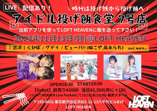 配信での「投げ銭」はもう古い!これからは「投げ飯」だ! UberEatsなどの出前アプリで「支払いは自分で、送り先を他に指定」出来る機能を使った「投げ飯」実験イベント、7回目の開催はLOFT HEAVENで開催!渋谷にいるアイドルたちにたくさんご飯をください!