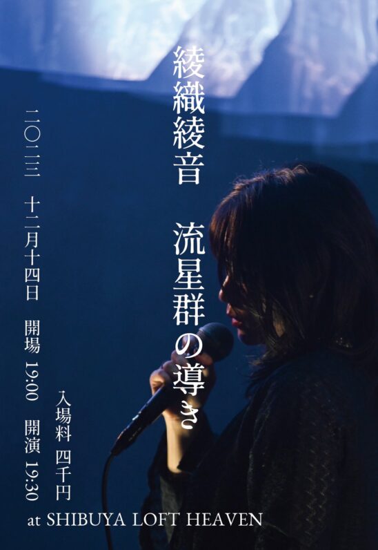 SCHEDULE 2023 12 14 Thursday 綾織綾音〜流星群の導き〜 OPEN 19:00 - START 19:30 Tweet 【出演】 綾織綾音 物語と音楽の融合。 綾織綾音独自の世界をお届けする夜 TICKET<チケット購入> 料金¥4,000 ※入場時ドリンク代¥600別途 ※椅子席(全席自由) ※整理番号順入場 https://t.livepocket.jp/e/20231214 販売期間:2023/6/14(水) 21:00 〜 2023/12/13(水) 23:59 Share