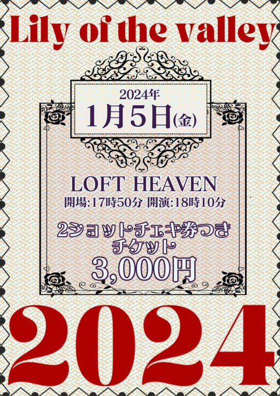 SCHEDULE 2024 01 05 Friday Lily of the valley 2024 OPEN 17:50 - START 18:10 Tweet 【出演】 Lily of the valley TICKET[会場チケット] 前売¥3,000(特典券1枚付き)/当日¥3,500 ※共にドリンク代600円別途必要 ※椅子席(全自由) https://t.livepocket.jp/e/lily2024 販売期間:2023/12/16(土) 20:00 〜 2024/1/5(金) 15:00 Share