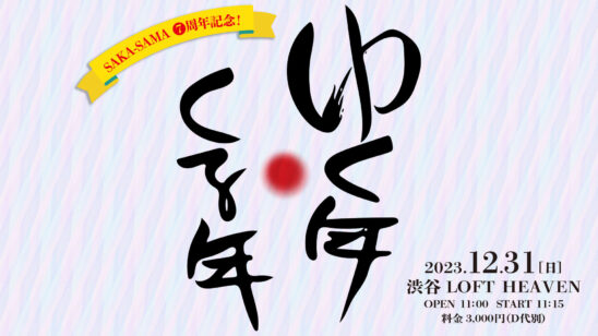 SCHEDULE 2023 12 31 Sunday DAY EVENT SAKA-SAMA7周年記念! SAKA-SAMAのゆく年くる年 OPEN 11:00 - START 11:15 Tweet 【出演】 SAKA-SAMA TICKET[会場チケット] 前売¥3,000 /当日¥3,500 ※それぞれドリンク代¥600別途必要 https://tiget.net/events/287764 受付終了日時:2023/12/31・AM7:00まで Share