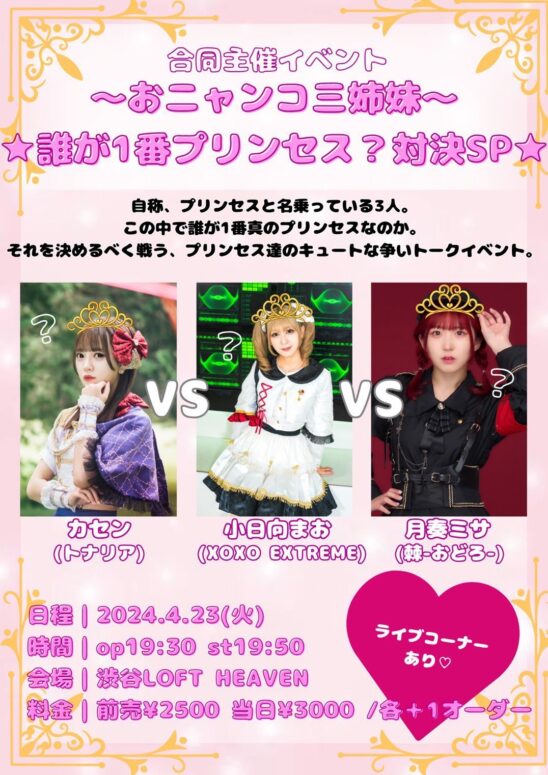 SCHEDULE 2024 04 23 Tuesday 合同主催イベント おニャンコ三姉妹 誰が1番プリンセス??対決SP OPEN 19:30 - START 19:50 Tweet 【出演】 カセン(トナリア) 小日向 まお(XOXO EXTREME) 月奏ミサ(棘-おどろ-) TICKET<会場チケット> 前売¥2,500/当日¥3,000 ※入場時ドリンク代¥600別途必要 ※整理番号順入場 https://tiget.net/events/307541 受付終了日時:2024/4/23 0:00まで Share