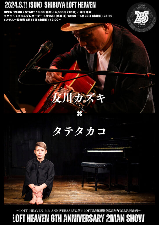 SCHEDULE 2024 08 11 Sunday LOFT HEAVEN 6th ANNIVERSARY&新宿LOFT歌舞伎町移転25周年記念共同企画 LOFT HEAVEN 6TH ANNIVERSARY 2MAN SHOW OPEN 19:00 - START 19:30 Tweet 【出演】 友川カズキ タテタカコ TICKET〈チケット情報〉 前売¥4,500/当日¥5,000 ※整理番号順入場 <会場チケット購入> https://eplus.jp/sf/detail/4082800001-P0030001 ・先行(抽選) 【受付期間】:5月15日(水)18:00~5月22日(水)23:59 ・一般(先着) 【発売日】:6月15日(土)12:00〜 Share