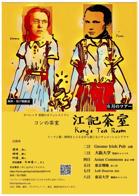 SCHEDULE 2024 06 07 Friday 香港プロテスト歌手『黒鳥』のレニー(郭達年) in Loft Heaven OPEN 18:30 - START 19:00 Tweet 【出演】 郭達年 珺珺 阿達 【ゲスト】 生田萬二 大熊ワタル こぐれみわぞう TICKET投げ銭制(ワンドリンク代¥600が必要です) 予約はこちらのサイトから(6/7公演です) Share