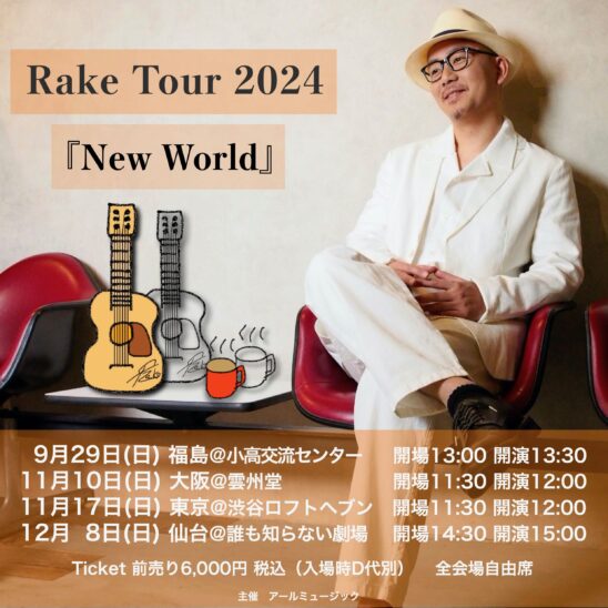 SCHEDULE 2024 11 17 Sunday DAY EVENT Rake Tour 2024 『New World』 ソロ弾き語りツアー OPEN 11:30 - START 12:00 Tweet 【出演】 Rake TICKET【会場チケット】 前売 ¥6,000 当日&メール予約チケット ¥6,500 ※全自由席 ※入場時ドリンク代¥600別途必要 チケット販売は6/9(日)10:00より先着制にて販売開始! 【ご入場順】 整理番号順 Rake公式ホームページ お問い合わせ contact.rake.music@gmail.com Share