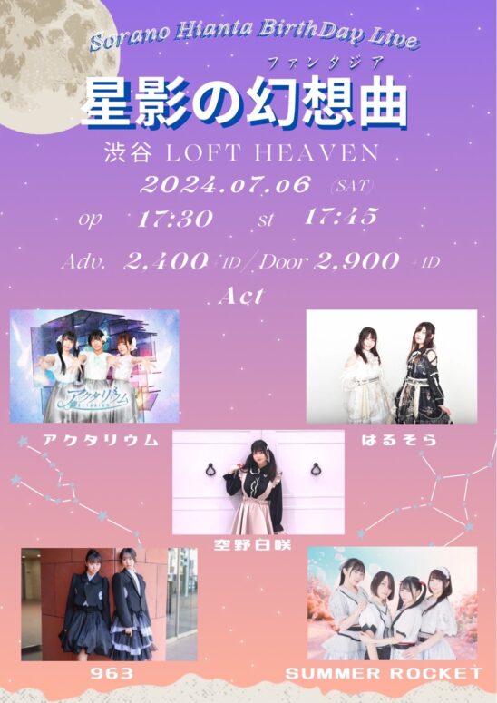 SCHEDULE 2024 07 06 Saturday 空野日咲 生誕祭『 星影の幻想曲 』 OPEN 17:30 - START 17:45 Tweet 【出演】 空野日咲 はるそら SUMMER ROCKET アクタリウム 963 TICKET[会場チケット] 予約¥2,400/当日¥2,900 ※それぞれドリンク代¥600別途必要 https://tiget.net/events/327260 Share
