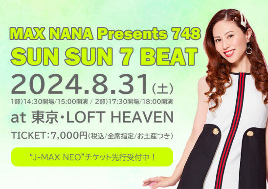 - 8月31日 (土)東京・LOFT HEAVENにて開催の『MAX NANA Presents 748 〜SUN SUN 7 BEAT〜 』は、台風10号の接近が予想される為、公共交通機関への影響を考慮し、協議の結果、ご来場を予定されている皆様、キャスト及びスタッフの安全を第一に考え中止とさせていただきます。
