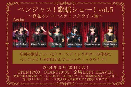 SCHEDULE 2024 08 20 Tuesday ベンジャス!歌謡ショー!vol.5 〜真夏のアコースティックライブ〜 OPEN 19:00 - START 19:30 Tweet 【出演】 ベンジャス! TICKET特典付前方チケット¥3,000 (前方4列 &特典は集合写メ特典会の最初に実施) 一般チケット:前売¥1,000/当日¥1,500 ※それぞれ入場時ドリンク代¥600別途必要 ※整理番号順入場となります。 https://t.livepocket.jp/e/bc7ow 販売期間:2024/7/29(月) 21:00 〜 2024/8/5(月) 23:59 Share