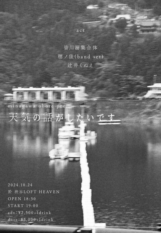 SCHEDULE 2024 10 24 Thursday minagawa obore pre. 「天気の話がしたいです」 OPEN 18:30 - START 19:00 Tweet 【出演】 皆川溺集合体 穂ノ佳(band set) 辻井くぬえ TICKET[チケット] 前売¥2,500/当日¥3,000 ※共にドリンク代600円別途必要 https://t.livepocket.jp/e/20241024 販売期間:2024/9/26(木) 22:00 〜 2024/10/23(水) 23:59 Share