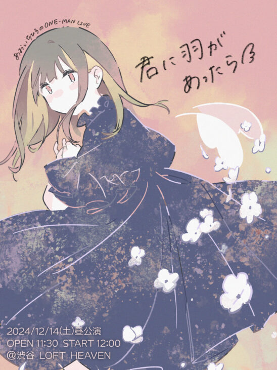 SCHEDULE 2024 12 14 Saturday DAY EVENT あおいちひろのONE-MAN LIVE「君に羽があったら」 OPEN 11:30 - START 12:00 Tweet 【出演】 あおいちひろ TICKET【会場チケット】 前売 ¥4,000(全席着席) ※ご入場時ドリンク代¥600別途必要 Livepocket 【ご入場順】 整理番号順 Share