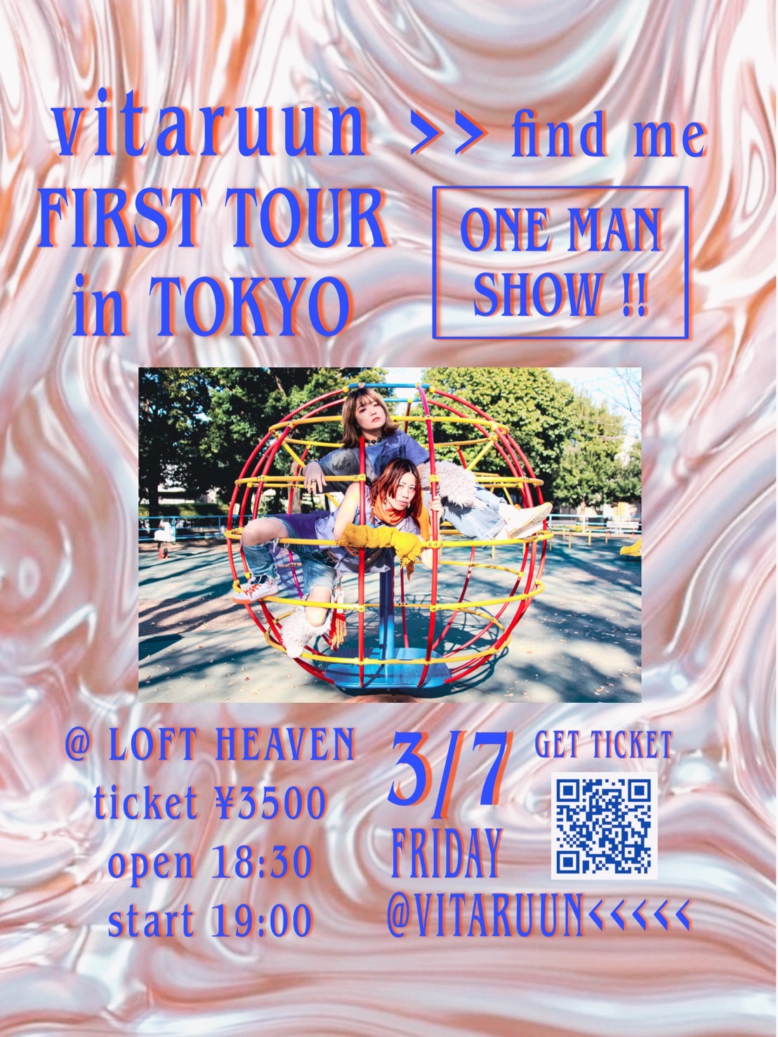 SCHEDULE 2025 03 07 Friday vitaruun 1st tour 『fine me』 OPEN 18:30 - START 19:00 Tweet 【出演】 vitaruun TICKET[会場チケット] 前売¥3,500/当日¥4,000 ※共にドリンク代600円別途必要 https://t.livepocket.jp/e/vitaruun_4 抽選受付期間:2024/12/21(土) 15:00 〜 2025/1/5(日) 23:59 #vitaruun Share