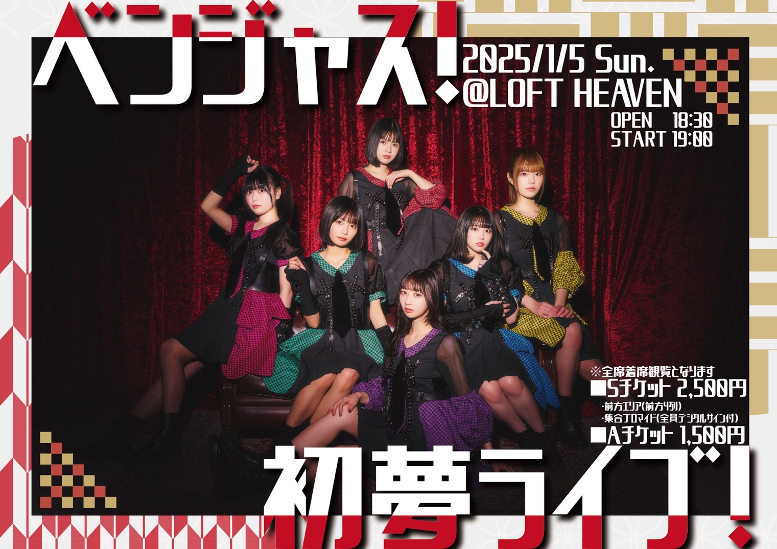 SCHEDULE 2025 01 05 Sunday ベンジャス!初夢ライブ! OPEN 18:30 - START 19:00 Tweet 【出演】 ベンジャス! TICKET<チケット> https://t.livepocket.jp/e/g0anw ■Sチケット 2,500円 ・前方エリア(前方4列) ・集合ブロマイド(全員デジタルサイン付) ■Aチケット 1,500円 ※入場順 / Sチケット⇒Aチケット 当日券+500円 ※それぞれ入場時ドリンク代¥600別途必要 #ベンジャス! Share