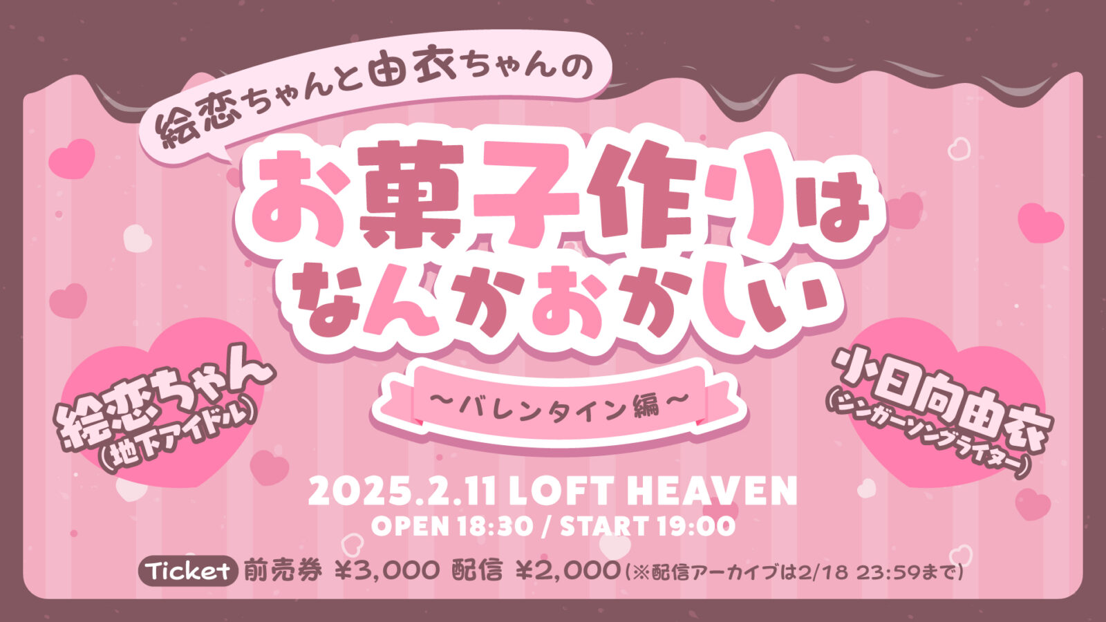 SCHEDULE 2025 02 11 Tuesday 絵恋ちゃんと由衣ちゃんの『お菓子作りはなんかおかしい〜バレンタイン編〜』 OPEN 18:30 - START 19:00 Tweet 【出演】 絵恋ちゃん(地下アイドル) 小日向由衣(シンガーソングライター) TICKET[チケット] https://perfectmusic.zaiko.io/item/369737 <会場> 前売¥3,000/当日¥3,500 ※入場時ドリンク代¥600別途必要 #絵恋ちゃん(地下アイドル)#小日向由衣(シンガーソングライター) Share