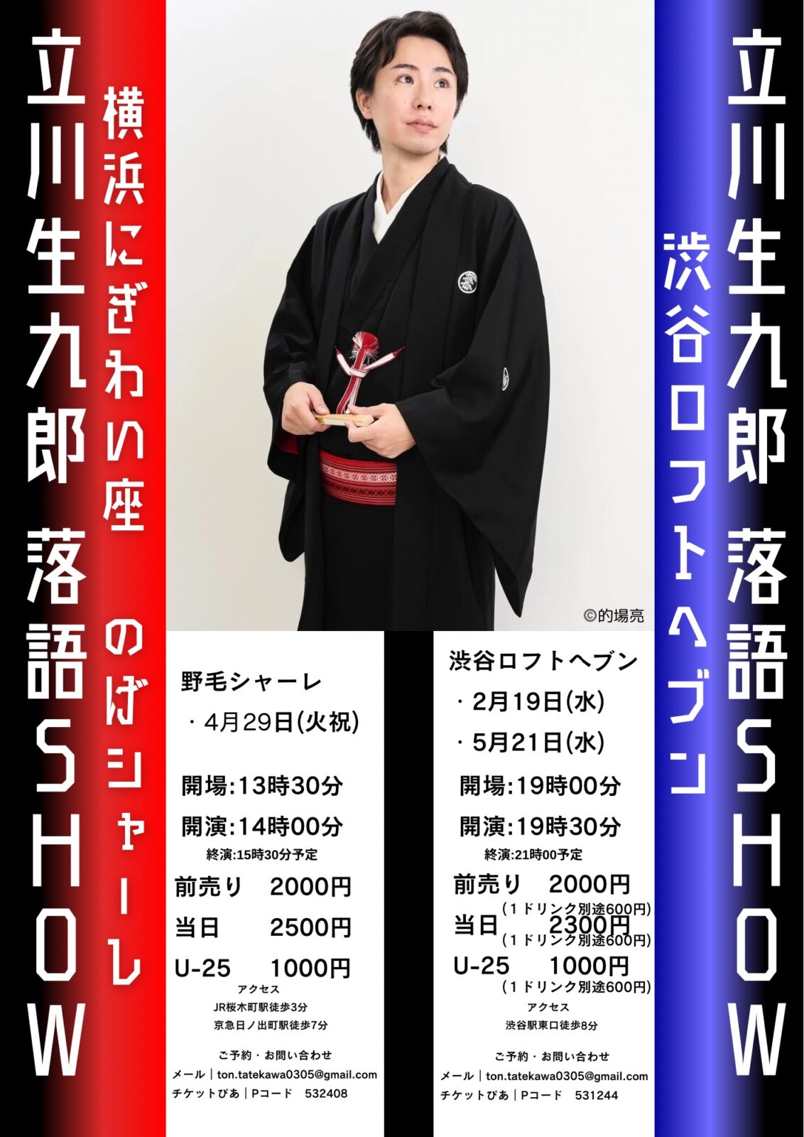 SCHEDULE 2025 02 19 Wednesday 立川生九郎落語show OPEN 19:00 - START 19:30 Tweet 【出演】 立川生九郎 TICKET https://t.pia.jp/pia/event/event.do?eventCd=2445279 <料金> 一般¥2,000 U-25¥1,000 ※入場時ドリンク代¥600別途必要 #立川生九郎 Share