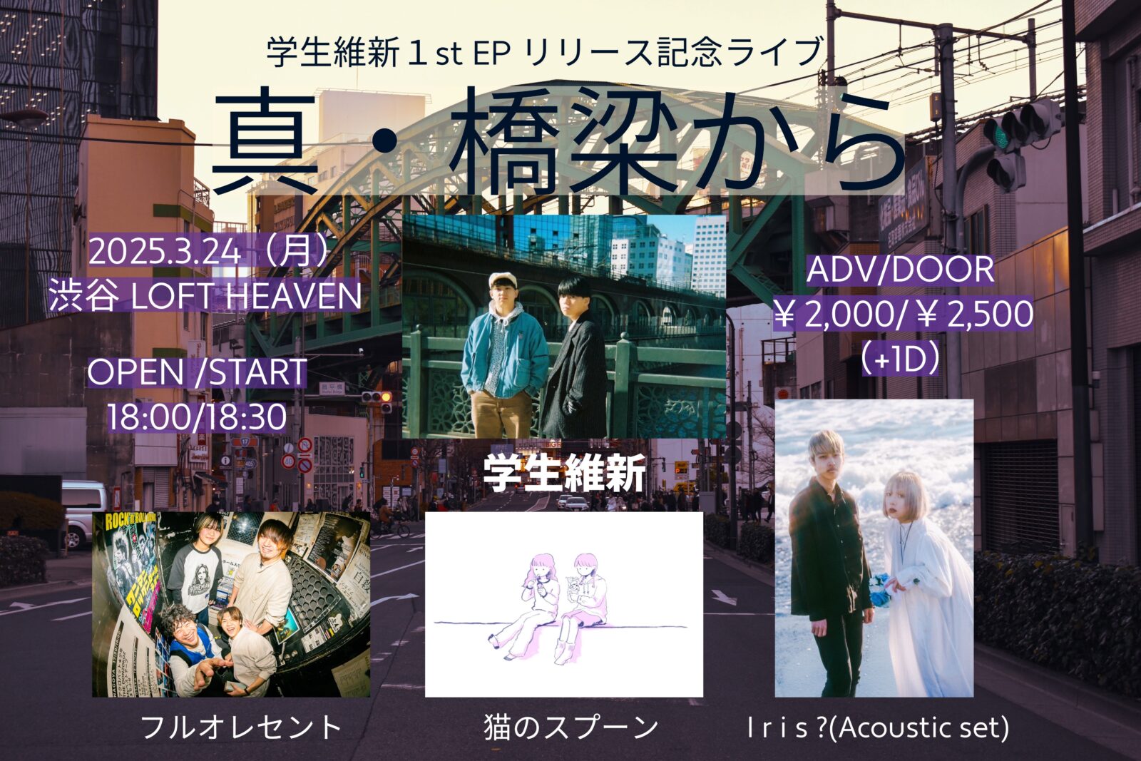 SCHEDULE 2025 03 24 Monday 学生維新1stEP発売記念『真・橋梁から』 OPEN 18:00 - START 18:30 Tweet 【出演】 学生維新 猫のスプーン フルオレセント I r i s ?(Acoustic set) TICKET前売¥2,000/当日¥2,500 入場時ドリンク代¥600別途必要 予約は各アーティストまで #学生維新#猫のスプーン#フルオレセント Share