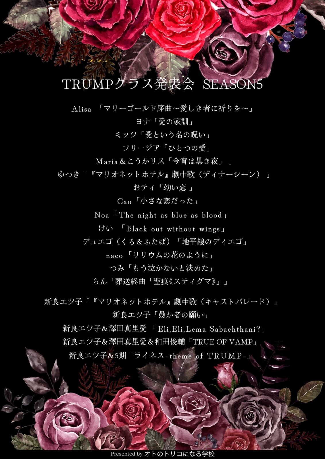 SCHEDULE 2025 03 29 Saturday TRUMPクラス SEASON5・最終発表会 OPEN 16:00 - START 16:30 Tweet TICKET<チケット> THANK YOU SOLD OUT!! 一般観覧チケット(自由席) ¥3,000 ※入場時ドリンク代¥600別途必要 ※全席着席型、整列順での入場 Share
