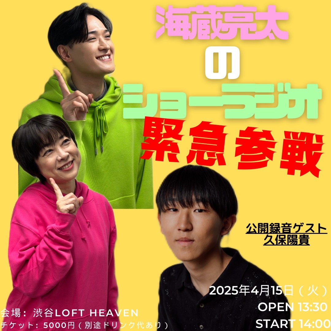 SCHEDULE 2025 04 15 Tuesday DAY EVENT 「海蔵亮太のショーラジオ」Vol.3 OPEN 13:30 - START 14:00 Tweet 【出演】 海蔵亮太 八木さおり 門田裕之 久保陽貴 TICKET<料金> ¥5,000 ※入場時ドリンク代600円別途必要) ※当日現地精算 ※ご予約は海蔵亮太のキューラジオ公式ラインへ ! #海蔵亮太#八木さおり#門田裕之 Share