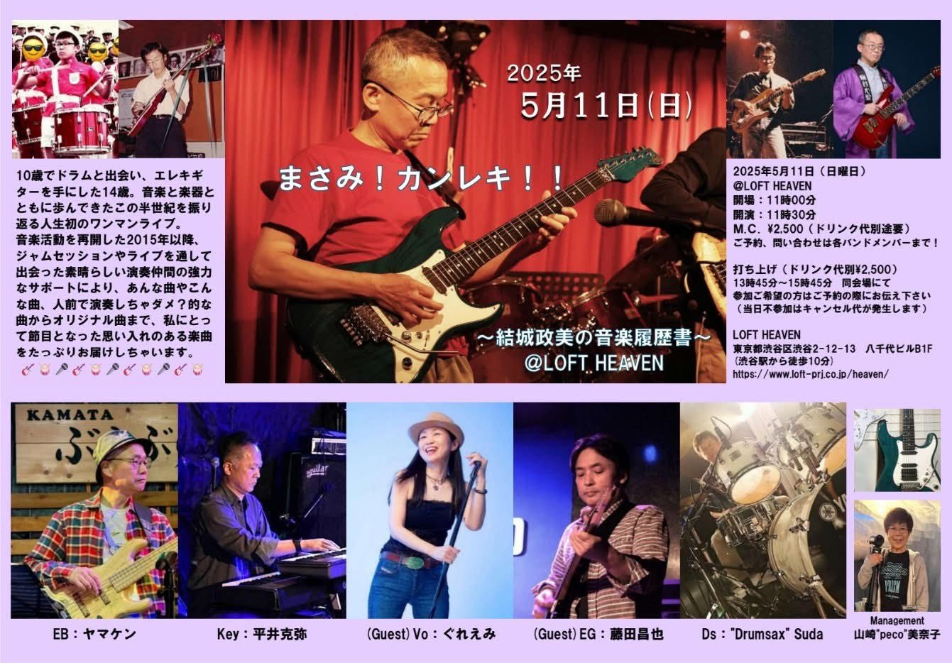 SCHEDULE 2025 05 11 Sunday DAY EVENT 結城政美の音楽履歴書 OPEN 11:00 - START 11:30 Tweet 【出演】 結城政美:EG,Ds,Vo ヤマケン:EB 平井克弥:Key “Drumsax” Suda:Ds (Guest) ぐれえみ:Vo 藤田昌也:EG TICKET料金¥2,500 (ドリンク代別途要) ご予約、問い合わせは各バンドメンバーまで! 打ち上げ (ドリンク代別 ¥2,500) Share