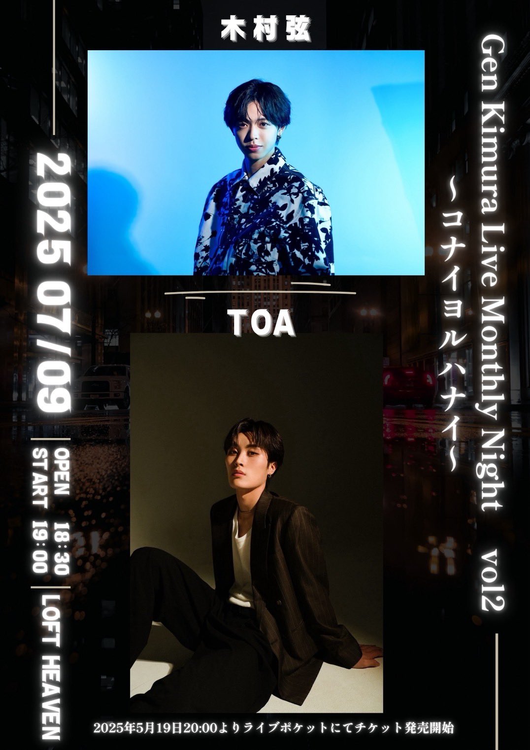 SCHEDULE 2025 07 09 Wednesday Gen Kimura Live Monthly Night〜コナイヨルハナイ〜vol.2 collaboration OPEN 18:30 - START 19:00 Tweet 【出演】 木村 弦 TOA (50音順) TICKET[会場チケット] 前売¥4,000/当日¥4,500 ※共にドリンク代600円別途必要 https://t.livepocket.jp/e/2025_0709 販売期間:2025/5/19(月) 20:00 〜 2025/7/8(火) 23:59 #木村弦#TOA Share
