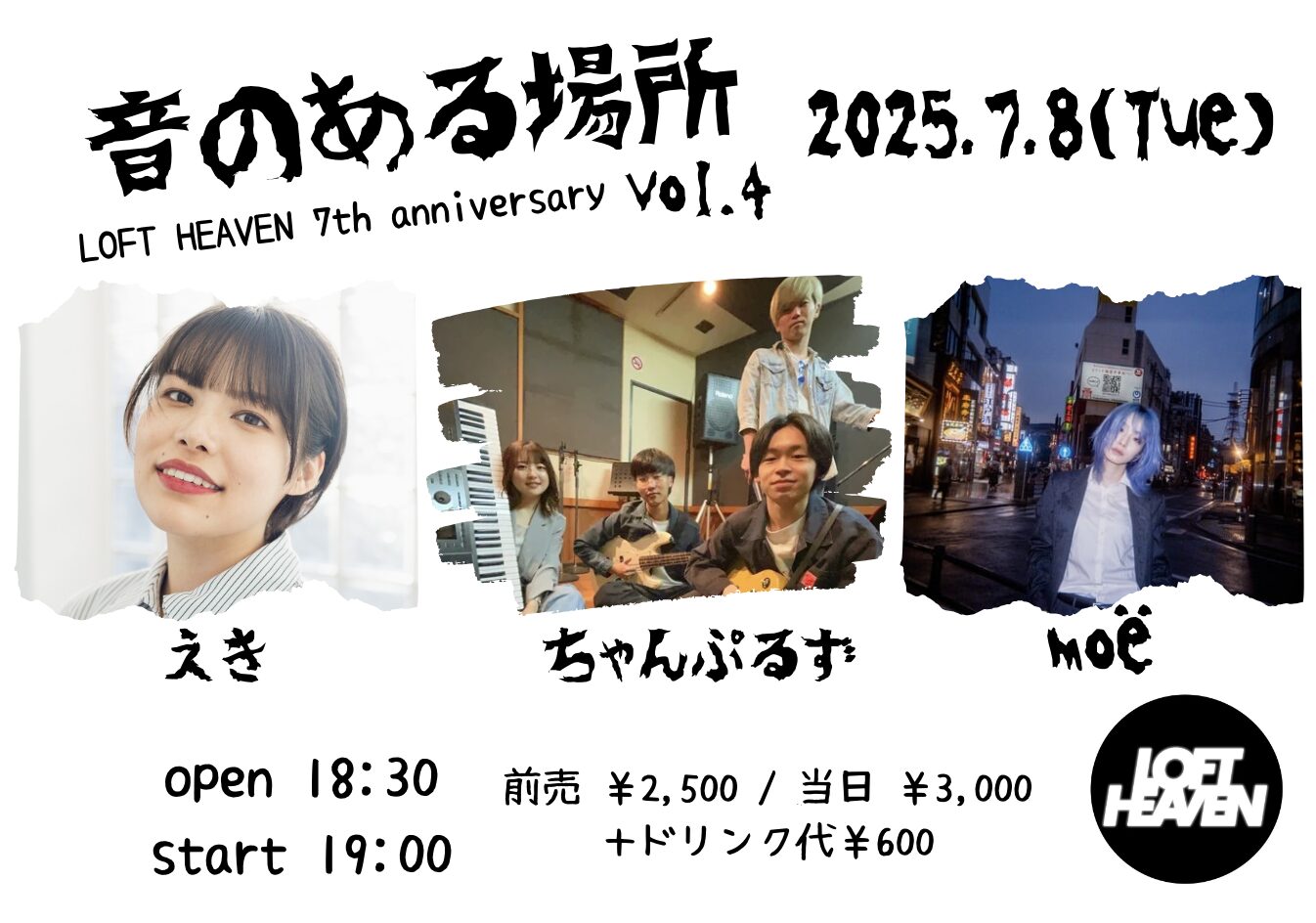SCHEDULE 2025 07 08 Tuesday 音のある場所 Vol,4 LOFT HEAVEN 7th anniversary OPEN 18:30 - START 19:00 Tweet 【出演】 えき ちゃんぷるず moë TICKET【会場チケット】 前売 ¥2,500 当日 ¥3,000 (入場時ドリンク代¥600別途必要) ご予約は5/26(月)18:00より 下記予約フォームにて受付開始! 【入場順】 ①当店HP予約(整理番号順) ②アーティスト予約(先着順) #えき#ちゃんぷるず#moë Share このイベントの予約は締めきりました。