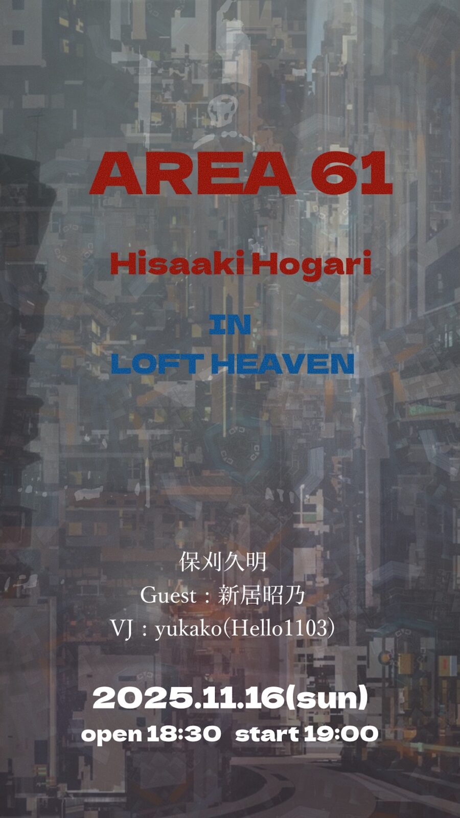 SCHEDULE 2025 11 16 Sunday 「AREA 61」 保刈久明(ホガリ ヒサアキ) OPEN 18:30 - START 19:00 Tweet 【出演】 保刈久明(ホガリ ヒサアキ) 【ゲスト】 新居昭乃 (アライ アキノ) 【VJ】 yukako(Hello1103) TICKET【会場チケット】 前売 ¥4,200 当日 ¥4,700 (入場時ドリンク代¥600別途必要) LivePocketにて8/1(金)12:00より販売開始! 【入場順】 整理番号順 Share
