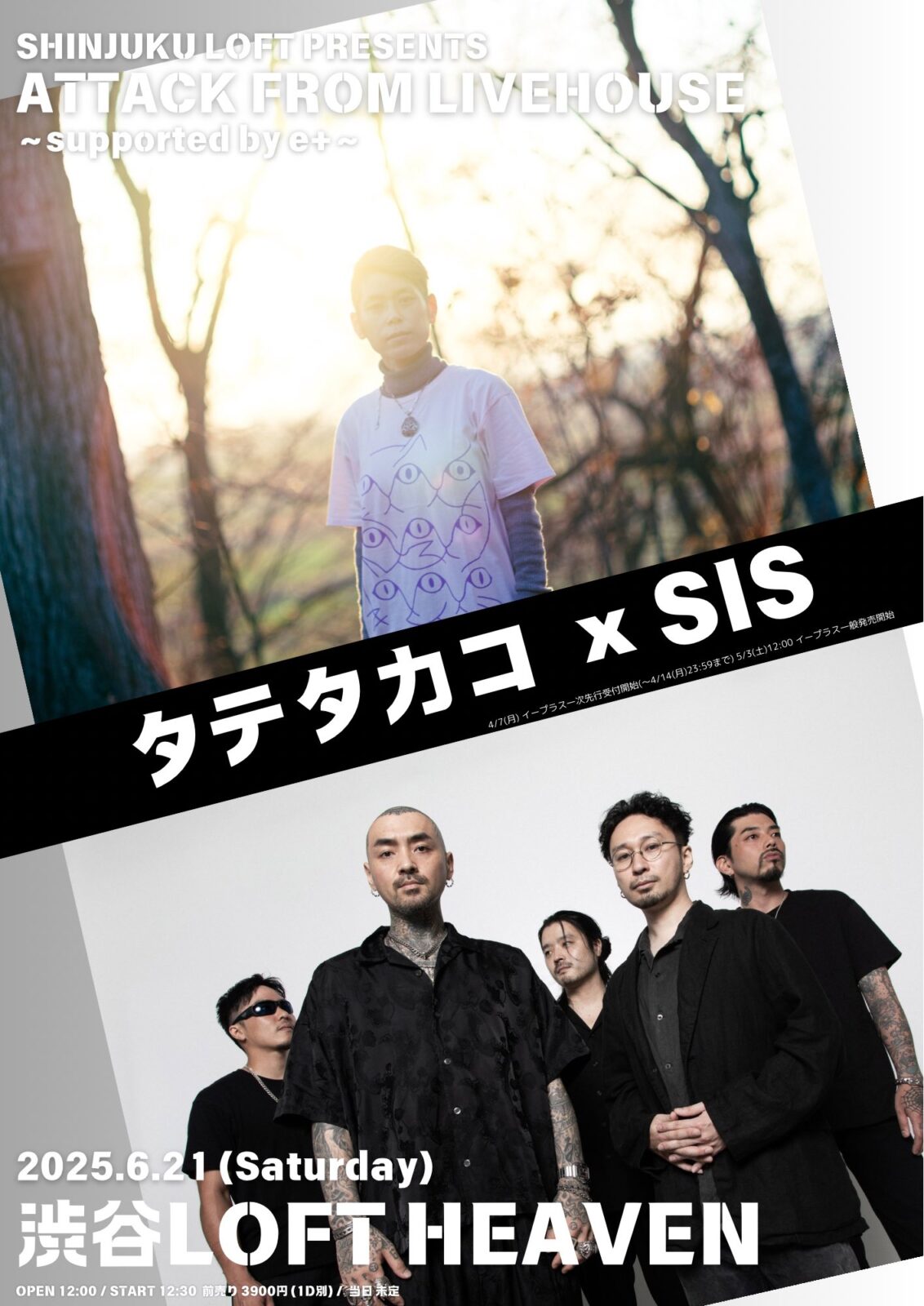 SCHEDULE 2025 06 21 Saturday DAY EVENT SHINJUKU LOFT PRESENTS 『ATTACK FROM LIVEHOUSE』supported by e+ OPEN 12:00 - START 12:30 Tweet 【出演】 タテタカコ SIS TICKET前売¥3,900/当日¥4,400 ※入場時ドリンク代¥600別途必要 https://eplus.jp/sf/word/0000169875 #タテタカコ#SIS Share