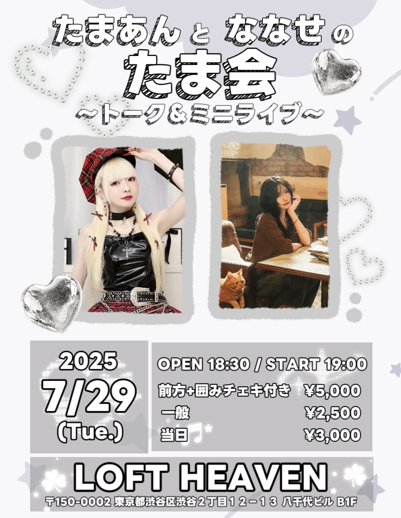 SCHEDULE 2025 07 29 Tuesday 『たまあんとななせのたま会~トーク&ミニライブ~』 OPEN 18:30 - START 19:00 Tweet 【出演】 たまきあんず 冬野ななせ TICKET【会場チケット】 前売 前方チケット(前方席、囲みチェキ特典付き) ¥5,000 前売 一般チケット ¥2,500 当日 ¥3,000 (入場時ドリンク代¥600別途必要) LivePocket 【入場順】 ①前方チケット(S1~) ②一般チケット(A1~) ③当日券 Share